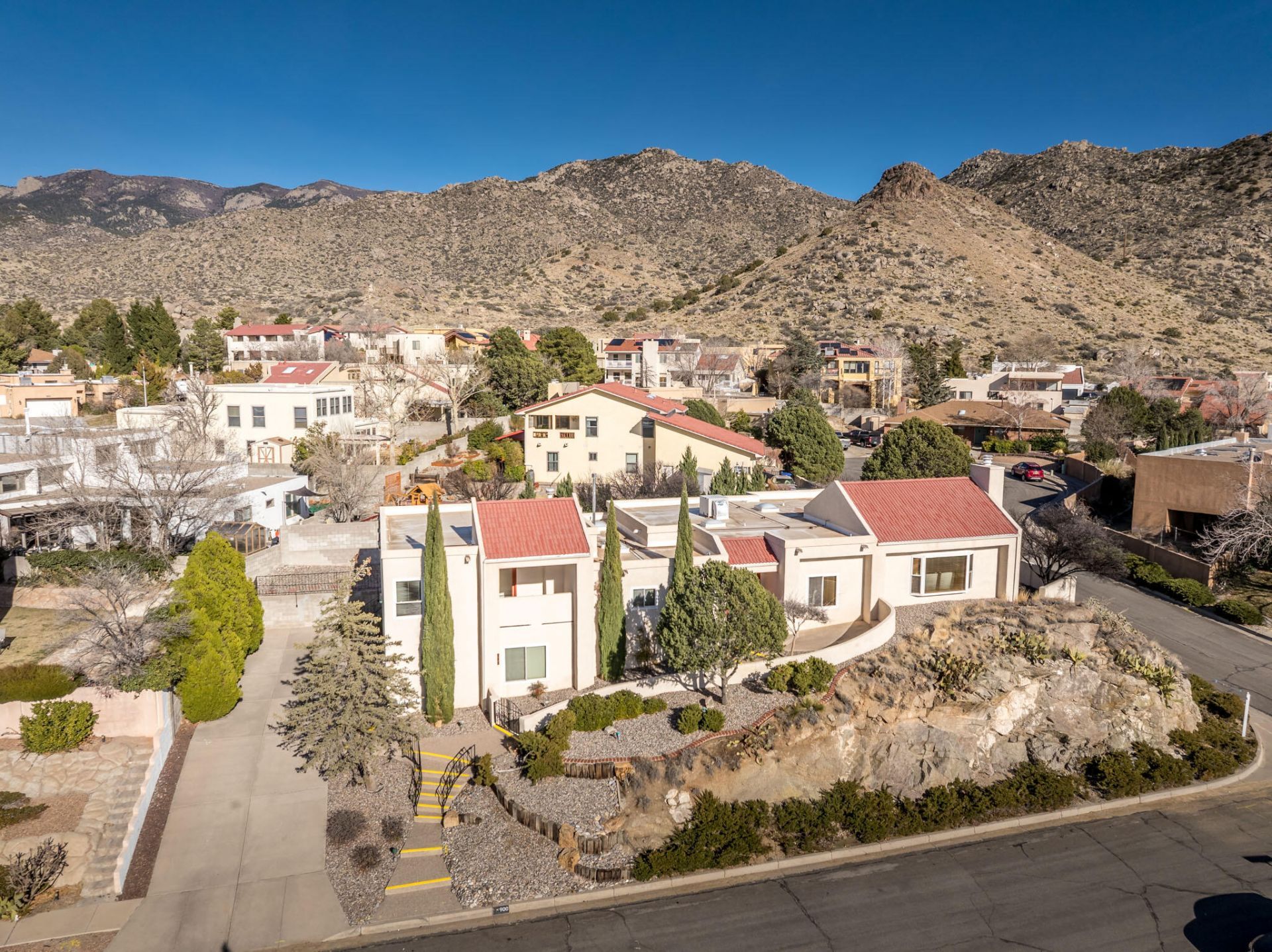 Nestled in the Sandia Foothills 1 block from Open Space, hiking, biking & sitting high above the city, this Custom Home has been meticulously maintained by the original owners. Breathtaking Western Sunsets & City Lights. The highly sought after Foothills location is close to Sandia Labs, Kirtland AFB & easy access to I 40. This split-level home offers bright light in every room, a spacious kitchen with granite countertops, custom cabinetry, & an induction rangetop for gourmet cooking. The open space concept incorporates the kitchen, dining, and family rooms, complete with a beautiful fireplace & full wet bar, ideal for family gatherings & entertaining. The large primary suite offers total privacy & serenity. Upgrades include Windows, TPO Roof, Skylights, Updated heating system & more.